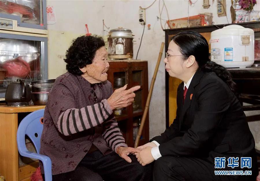 黄志丽(右)来到福建漳州市芗城区古塘村,看望她多年照顾的独居老人(2016年3月17日摄)。